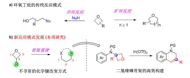 最近我校石油化工學院新引進的青年教師黃海博士與孫建偉教授在Angew. Chem. Int. Ed.上共同發(fā)表題為“Unusual Skeletal Reorganization of Oxetanes for the Synthesis of 1,2-Dihydroquinolines”的研究論文。骨架重排是有機化學中重要且有趣的反應(yīng)模式,它能夠構(gòu)建出很多復(fù)雜但實用價值很高的有機分子骨架。因此,探索特殊官能團骨架重排反應(yīng),揭示其反應(yīng)規(guī)律是有機合成中重要的研究方向。本論文實現(xiàn)了一種關(guān)于環(huán)氧丁烷特殊骨架重排反應(yīng),這是繼環(huán)氧丁烷傳統(tǒng)開環(huán)和擴環(huán)反應(yīng)方式上的一次全新的反應(yīng)模式突破。通過本骨架重排策略,能夠高效快速的構(gòu)建二氫喹啉骨架。后期應(yīng)用顯示,目標分子具有很高的合成價值,是一類不可或缺的骨架結(jié)構(gòu)。