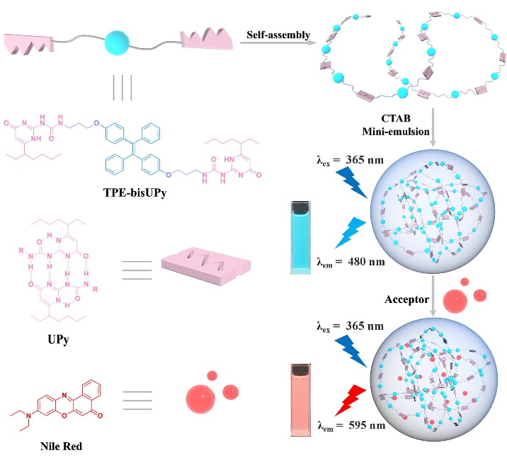 近日,我院孫小強/王樂勇聯(lián)合團隊青年教師肖唐鑫博士在Chemical Communications上發(fā)表研究論文(DOI: 10.1039/D0CC05077F)。光合作用是自然界的普遍現(xiàn)象,是一切生命的基礎。模擬光合作用的光能捕獲和能量轉移過程具有重大意義。本論文利用TPE基團橋連的雙UPy化合物作為天線分子和給體,通過四重氫鍵形成超分子聚合物,并進一步在水溶液中通過微乳化組裝成超分子納米顆粒,并負載NiR染料作為能量受體,構筑了一個基于水相的超分子光捕獲體系,并展現(xiàn)出高效的能量轉移效率和天線效應以及顏色可調的發(fā)光功能。
