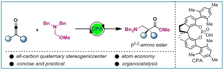 孫江濤團(tuán)隊(duì)發(fā)展了一種以烯酮和N,O-縮醛為原料,在手性磷酸催化下實(shí)現(xiàn)了烯酮的不對(duì)稱(chēng)胺甲基化,從而簡(jiǎn)潔、高效、綠色合成光學(xué)純的β2,2-氨基酸的新方法。