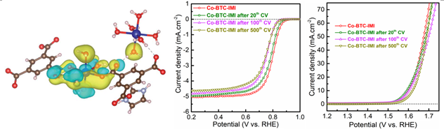 純相金屬有機骨架(MOFs)在催化領(lǐng)域具有巨大的應(yīng)用潛力,但是由于這類材料的導電性不夠高,在能源轉(zhuǎn)換和存儲電催化領(lǐng)域中應(yīng)用受到的限制。銀鳳翔、陳標華課題組理論計算研究發(fā)現(xiàn),MOFs中的不飽和配位能降低空間位阻,促進活性中心與水分子和氧氣分子的相互作用,降低電子傳導阻力,提高材料的導電性,使得這種MOFs在電催化中具有增強的質(zhì)量傳遞和電子傳遞特性。根據(jù)這一發(fā)現(xiàn),課題組采用鈷離子、均苯三甲酸和咪唑通過水熱反應(yīng)合成了金屬有機骨架Co-BTC-IMI,該材料中的一個Co離子分別被兩個去質(zhì)子化的均苯三甲酸連接,構(gòu)建了Co金屬中心的不飽和配位。該金屬有機骨架在堿性半電池中可提供0.80 V(參比可逆氫電極)的氧氣還原反應(yīng)半波電勢,并在10 mA·cm-2電流密度下提供了1.59 V(參比可逆氫電極)的氧氣析出反應(yīng)電勢。該工作在將純相MOFs直接應(yīng)用于氧氣電催化領(lǐng)域中取得了突破性進展,為能源轉(zhuǎn)換和存儲科學和技術(shù)的發(fā)展提供了新的思路。近日,該成果已經(jīng)發(fā)表于國際頂級期刊Journal of Materials Chemistry A上。此項工作得到了江蘇省綠色催化重點實驗室、江蘇省自然科學基金以及國家自然科學基金的資助。