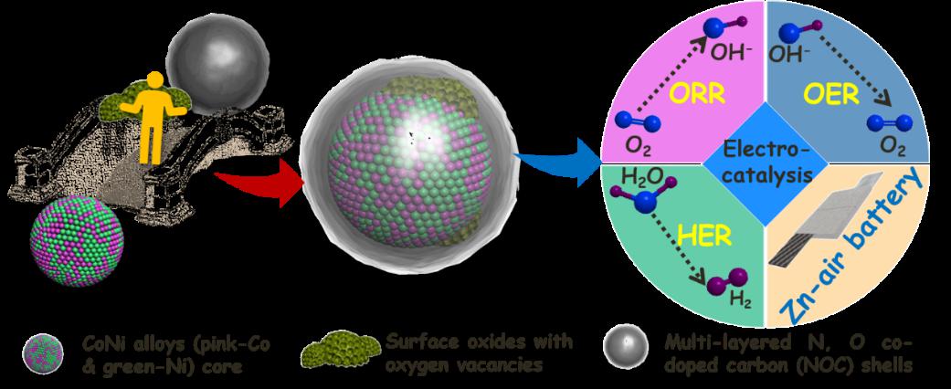 氧氣還原、氧氣析出以及氫氣析出等小分子電催化反應(yīng)是鋅空氣電池、鋰空氣電池、燃料電池以及電化學(xué)分解水制氫等能量存儲(chǔ)與轉(zhuǎn)換技術(shù)的核心反應(yīng),然而它們均是動(dòng)力學(xué)慢反應(yīng),都需要使用催化劑來(lái)加速它們的反應(yīng),從而提高存儲(chǔ)和轉(zhuǎn)換效率。在單一催化劑上實(shí)現(xiàn)多功能電催化一直是該領(lǐng)域研究的熱點(diǎn)和重點(diǎn),這對(duì)于降低上述能量存儲(chǔ)與轉(zhuǎn)換器件結(jié)構(gòu)的復(fù)雜性、大幅度提高性能,促進(jìn)它們的產(chǎn)業(yè)化都具有重要意義。銀鳳翔-陳標(biāo)華課題組的何小波副研究員利用CoNi-雙金屬有機(jī)骨架材料為前驅(qū)體,開(kāi)發(fā)了一種“表面輕微氧化的CoNi 合金@氮/氧共摻雜碳”的多功能催化劑。這種多功能催化劑擁有媲美于貴金屬催化劑的氧氣還原、氧氣析出以及氫氣析出的高效電催化性能。更為突出的是,這種電催化劑使得鋅空氣電池?fù)碛?/span>98.6%的理論比容量和74.8%的理論能量密度,并且超過(guò)100小時(shí)運(yùn)行后鋅空氣電池的性能幾乎沒(méi)有衰減。深入的構(gòu)-效關(guān)系研究發(fā)現(xiàn),該催化劑中CoNi合金納米顆粒表面存在的少量氧化層起到了關(guān)鍵作用。這種關(guān)鍵作用主要體現(xiàn)在以下兩個(gè)方面:(一)少量氧化層“富含”氧空位,氧空位促進(jìn)了從CoNi合金納米顆粒(核心)到氮/氧共摻雜碳(外殼)的電子轉(zhuǎn)移,從而優(yōu)化了在電催化過(guò)程中起直接催化作用的氮/氧共摻雜碳中活性位的電子結(jié)構(gòu)及其對(duì)反應(yīng)物種的吸脫附能力,最終使得CoNi合金納米顆粒(核心)和氮/氧共摻雜碳(外殼)在多功能電催化過(guò)程中能夠分別“間接”與“直接”地貢獻(xiàn)各自的作用;(二)“富含”氧空位的少量氧化層還增強(qiáng)了催化劑的整體導(dǎo)電性,從而促進(jìn)了催化劑、電解液與氣態(tài)反應(yīng)物(產(chǎn)物)之間的三相界面電荷轉(zhuǎn)移,最終有利于加速多功能電催化反應(yīng)過(guò)程。