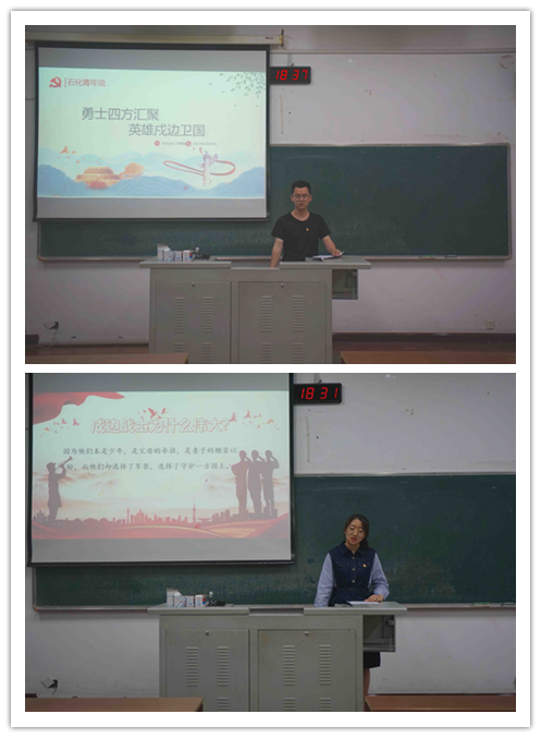 為弘揚(yáng)愛國(guó)民族精神、致敬戍邊英雄,謳歌偉大的中國(guó)共產(chǎn)黨,6月21日晚6:30,我院于w1202教室開展以“勇士四方匯聚,英雄戍邊衛(wèi)國(guó)”為主題的石化青年說(shuō)。本次宣講由團(tuán)委副書記王博智主持,應(yīng)化201班王姣杰、應(yīng)化202班石智鋒主講,各班級(jí)代表參加。