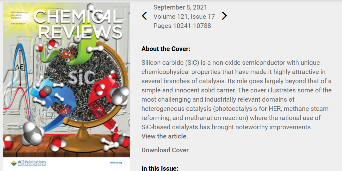 近日,郭向云教授應(yīng)邀與意大利國家研究委員會、中科院大連化學(xué)物理研究所、SICAT公司、法國國家科研中心等研究人員合作撰寫的關(guān)于高比表面積碳化硅催化應(yīng)用的綜述文章“Porous Silicon Carbide (SiC): A Chance for Improving Catalysts or Just Another Active-Phase Carrier?”在化學(xué)領(lǐng)域國際頂級綜述類雜志Chemical Reviews上作為封面文章發(fā)表。該論文系統(tǒng)地介紹了碳化硅作為催化劑載體在催化領(lǐng)域中的應(yīng)用情況:(1)精細(xì)化學(xué)品合成,如烷烴氧化制烯烴和含氧化合物、不飽和鍵加氫、C-X鍵形成等;(2)燃料制備,如各種液體燃料、天然氣和氫氣;(3)環(huán)境保護(hù)和修復(fù),如水和空氣中有機(jī)污染物的氧化脫除及分解;(4)燃料電池催化劑,如甲醇和乙醇的電氧化、氧氣還原等;(5)光催化過程,如光解水產(chǎn)氫、精細(xì)化學(xué)品光催化合成、有機(jī)污染物降解等;(6)碳化硅復(fù)合物無金屬催化劑等。并就碳化硅催化劑研究中應(yīng)該關(guān)注的重點(diǎn),以及未來發(fā)展趨勢作了展望。