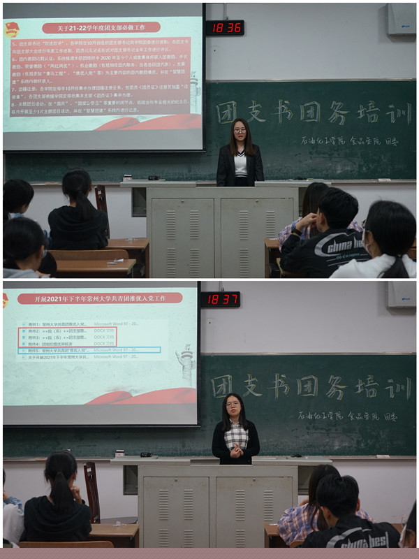 院團(tuán)委書(shū)記孫潘老師從思想建設(shè)方面講述了共青團(tuán)工作的重要性,指出各團(tuán)支部應(yīng)從信仰公開(kāi)課入手加強(qiáng)團(tuán)員思想教育,做好團(tuán)員發(fā)展與后續(xù)教育工作,加強(qiáng)團(tuán)支部建設(shè),提升團(tuán)支部凝聚力。副書(shū)記許涵僑同學(xué)對(duì)“雙述雙評(píng)”、“團(tuán)日活動(dòng)”、“黨史學(xué)習(xí)會(huì)”的開(kāi)展進(jìn)行了具體培訓(xùn),并對(duì)下半年推優(yōu)工作進(jìn)行了具體布置。