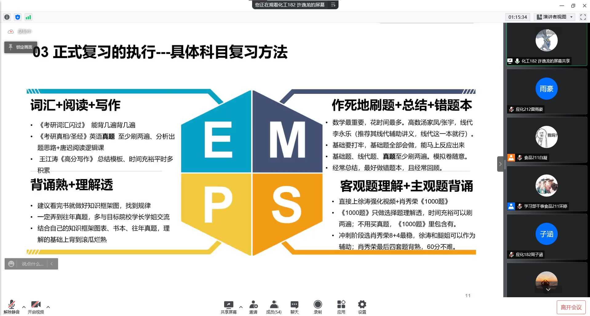 為營(yíng)造良好學(xué)風(fēng),鼓勵(lì)學(xué)生挖掘自身潛能、把握深造機(jī)會(huì),我院于2022年4月15日、22日、29日在騰訊會(huì)議開展三場(chǎng)“研”路有你主題榜樣宣講活動(dòng),本次宣講由成功上岸南京大學(xué)、廈門大學(xué)、大連理工大學(xué)、中國石油大學(xué)和華東理工大學(xué)等14所高校的學(xué)生主講。