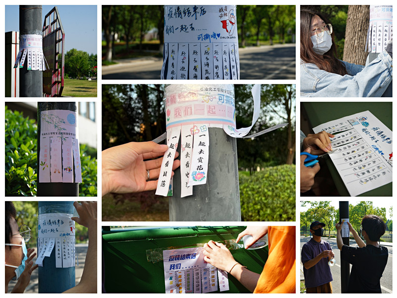 各具風(fēng)格的手制便利貼上,極具創(chuàng)意的圖案文字、小心翼翼的邊框剪裁,每一筆都蘊(yùn)含著激情、每一筆都蘊(yùn)含著希望。燈柱上、樹干上、花壇旁……校園內(nèi)的各個(gè)角落都貼滿了“濃濃真情”,成為校園內(nèi)別樣的風(fēng)景線?!耙黄鸪曰疱仭?、“一起看電影”、“一起去露營”、“一起去海邊”、“一起去音樂節(jié)”······這些心愿便利貼飽含著同學(xué)們對(duì)解封校園的期待,承載著“成功抗擊疫情”的愿望。