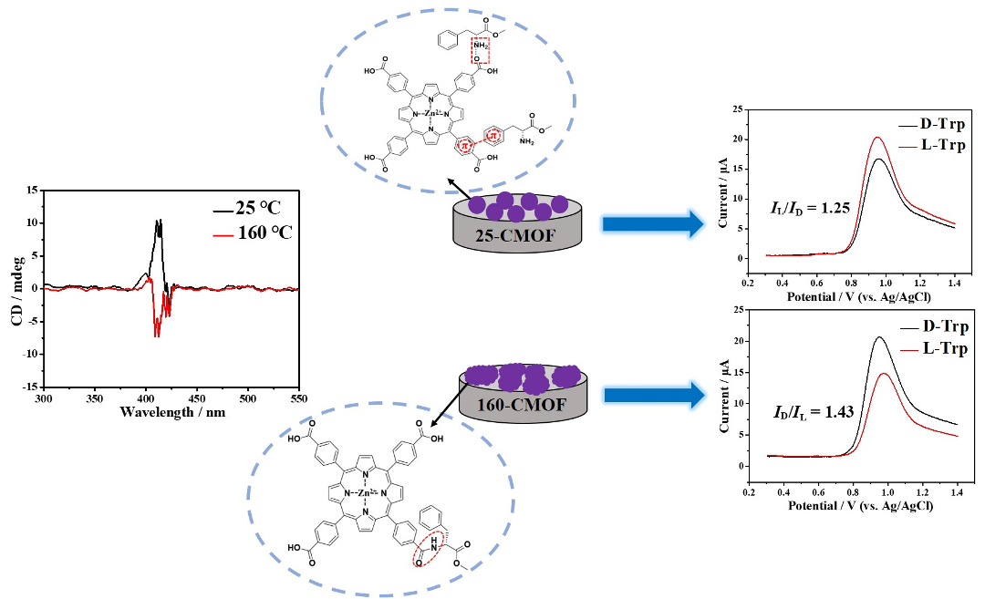 手性金屬-有機框架(CMOF)在手性識別和分離領域中引起了廣泛關注。將Zn2+作為中心金屬離子,四對羧基苯基卟啉TCPP作為有機配體,D-苯丙氨酸甲酯(D-Phe-OMe)作為手性源,通過簡單的“一鍋法”合成了CMOF。由于TCPP和D-Phe-OMe在