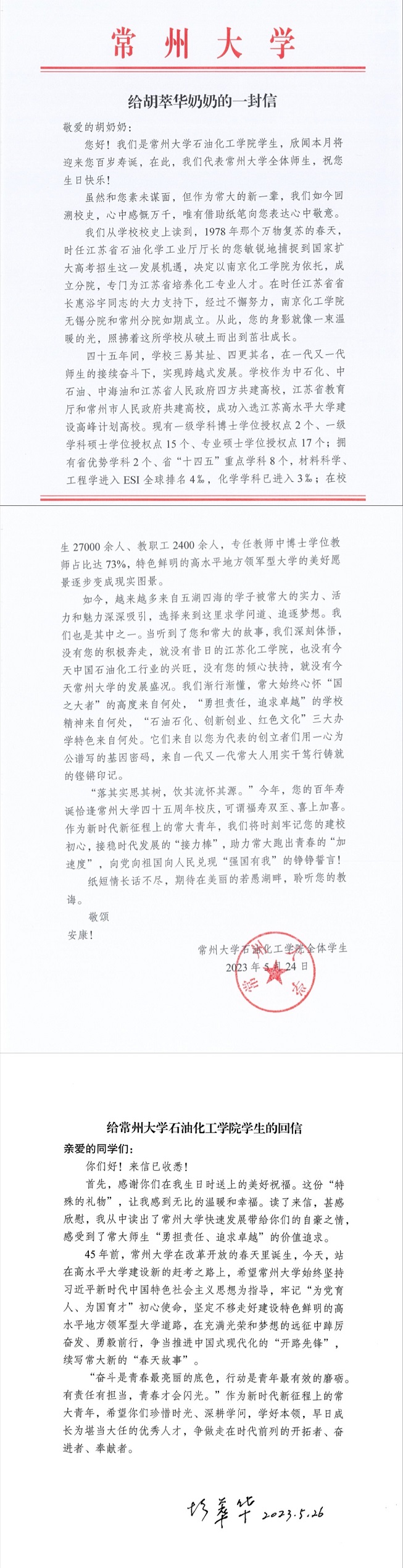 胡老高興地回憶起壽誕前夕與常大學(xué)子通信的故事。不久前,石油化工學(xué)院學(xué)生得知,他們?nèi)f分敬仰的胡萃華奶奶即將迎來百歲壽誕。為了表達(dá)心中敬意,同學(xué)們給胡奶奶寫了一封信,信中匯報(bào)了學(xué)校發(fā)展變化的情況和他們奮發(fā)學(xué)習(xí)的志向。胡奶奶很快就回了信,在信中不僅高度肯定了學(xué)校45年來的跨越式發(fā)展,還寄語常大學(xué)子,希望同學(xué)們珍惜時(shí)光、深耕學(xué)問、學(xué)好本領(lǐng),早日成長為堪當(dāng)大任的優(yōu)秀人才,爭做走在時(shí)代前列的開拓者、奮進(jìn)者、奉獻(xiàn)者。