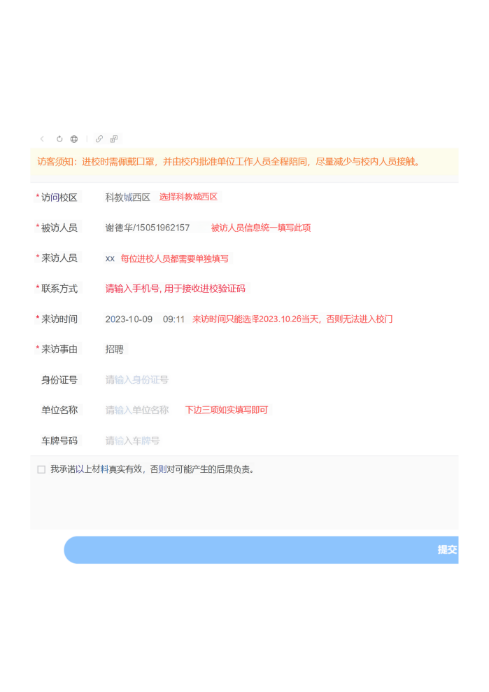 ③信息填寫完畢后點擊提交,審核通過后將收到預(yù)約信息登記成功短信并附帶入校鏈接,入校時請點擊鏈接生成入校二維碼并向門衛(wèi)出示即可。