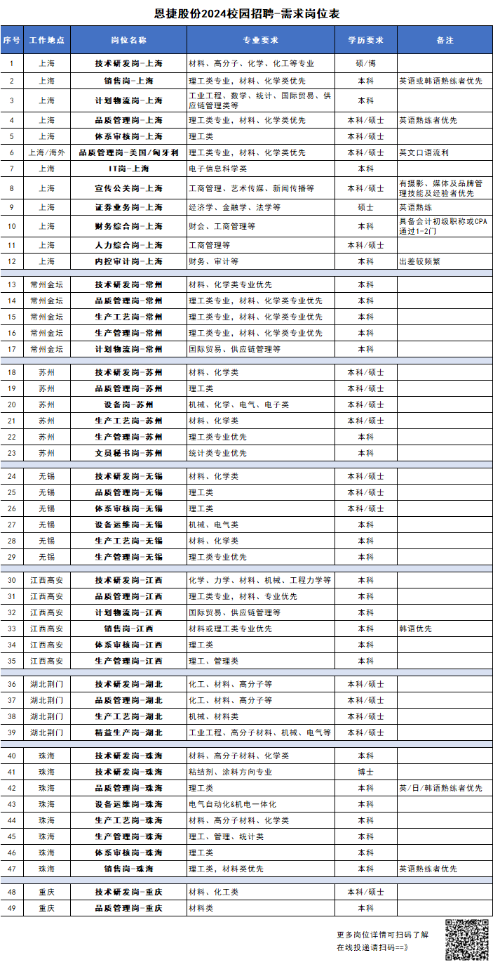 上海恩捷新材料科技股份有限公司是全球領先的鋰電池隔膜行業(yè)龍頭企業(yè),22年鋰電池隔膜全球市場占有率46%。新能源行業(yè),24年校招崗位200+,工作地點覆蓋上海、常州、無錫、蘇州、江西、湖北、重慶、珠海、匈牙利、美國等,恩捷希望優(yōu)先從常州大學引進化工、能源、化學、材料等專業(yè)優(yōu)秀的本科、碩士、博士人才!簡歷投遞郵箱:recruiter@semcorpglobal.com。