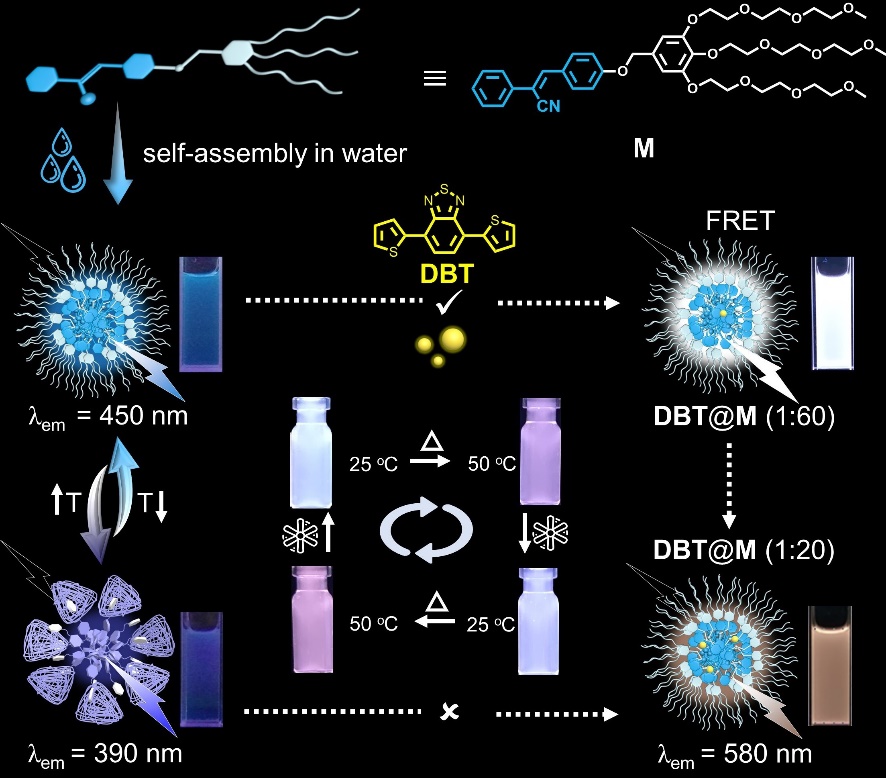 在前期的研究中,課題組開發(fā)了若干人工超分子光捕獲系統(tǒng)(J. Mater. Chem. A2022, 10, 8528-8534. Chem. Commun., 2022, 58, 2343-2346.)和溫度響應(yīng)有機熒光材料(Chem. –Eur. J.2023, 29, e202203463. Chin. Chem. Lett., 2023, 34, 108617.)。在這些工作究的基礎(chǔ)上,同時基于自然界光合作用受溫度影響的啟發(fā),課題組近期在水相中又構(gòu)筑了一種具有可調(diào)白光發(fā)射的溫度響應(yīng)型人工光捕獲系統(tǒng),相關(guān)工作以“A temperature-responsive artificial light-harvesting system in water with tunable white-light emission”為題發(fā)表在國際材料化學(xué)權(quán)威雜志Journal of Materials Chemistry A上(J. Mater. Chem. A, 2023, 11, 18419-18425. IF: 11.9)。