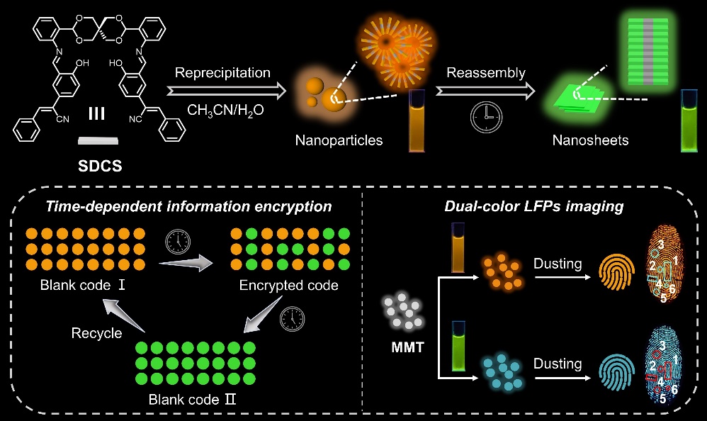 具有隨時間變化發(fā)光顏色的有機發(fā)光材料在化學(xué)傳感、高分辨率生物成像和高安全性信息加密等領(lǐng)域顯示出廣闊的應(yīng)用前景?;诖?,研究組開發(fā)了一種橋連的氰基苯乙烯衍生物SDCS作為CH3CN/H2O混合溶劑中的單一組分的時間依賴熒光系統(tǒng)。具體來說,通過再沉淀法從SDCS制備的原始橙色發(fā)光納米顆??梢栽诔肿幼越M裝的驅(qū)動下隨著時間的推移轉(zhuǎn)變?yōu)榫G色發(fā)光納米片。值得注意的是,這種轉(zhuǎn)化速率可以通過調(diào)整含水量來控制?;谶@些獨特的屬性,時變熒光二進制碼被開發(fā)出來,從而實現(xiàn)了具有更高安全性的時間依賴信息加密。此外,SDCS的雙色發(fā)光可以通過固體基質(zhì)來獨立固定,如被固定在水凝膠或粉末中。其中被固定在蒙脫土中所得的發(fā)光粉末成功地用于潛指紋的雙色熒光成像。這項工作展示了利用超分子策略控制單組分系統(tǒng)中的多重發(fā)射性質(zhì)并賦予其多功能應(yīng)用。相關(guān)工作以“Dynamic Time-Dependent Emission in Solution and Stable Dual Emission in Solid Matrix Exhibited by a Single-Component Fluorescence System”為題發(fā)表在國際材料科學(xué)權(quán)威雜志Advanced Functional Materials上(Adv. Funct. Mater.2024, doi: 10.1002/adfm.202314093. IF: 19.0)。