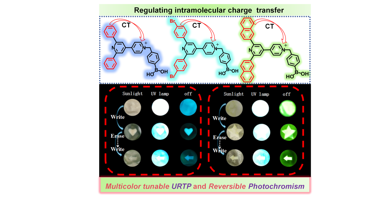 動態(tài)光致變色長壽命室溫磷光材料是一類兼具結(jié)構(gòu)色變化與發(fā)光特性可調(diào)(強(qiáng)度、壽命及顏色)的智能光學(xué)材料,在高級防偽、信息加密、傳感等領(lǐng)域具有巨大應(yīng)用潛能。然而,如何將光致變色和長壽命室溫磷光功能有效整合到單一聚合物體系,以構(gòu)筑出多色可調(diào)的高性能的動態(tài)光致變色長壽命室溫磷光聚合物,仍面臨巨大挑戰(zhàn)。我們研究團(tuán)隊策略性地將具有可調(diào)控分子內(nèi)電荷轉(zhuǎn)移(ICT)能力的非線性吡啶鎓單元嵌入剛性聚乙烯醇(PVA)基質(zhì)中,成功地開發(fā)了多色可調(diào)的動態(tài)光致變色長壽命室溫磷光聚合物。