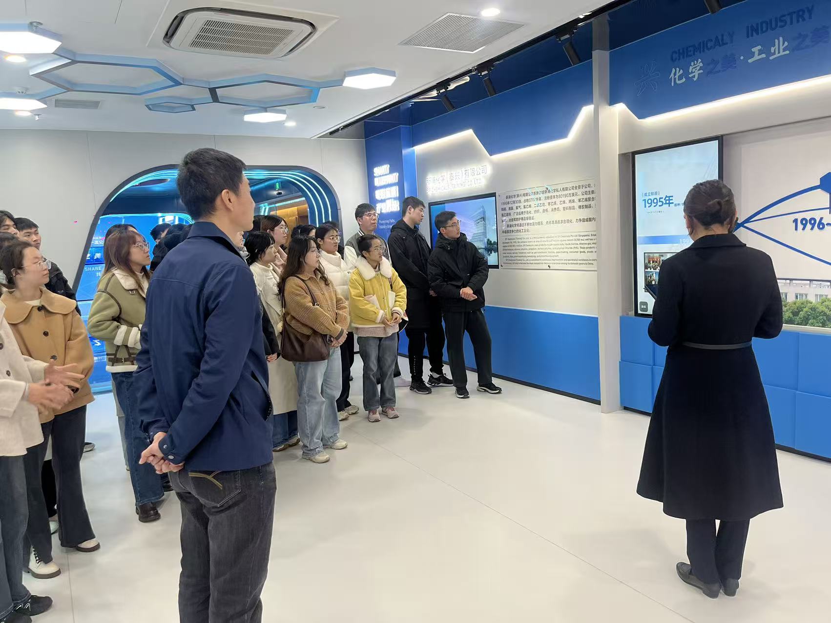 師生一行參觀了企業(yè)展廳,工作人員講解了新浦化學(xué)的發(fā)展歷史、智能控制系統(tǒng)、生產(chǎn)工藝流程,讓同學(xué)們直觀地了解化工生產(chǎn)運(yùn)行模式和智能化轉(zhuǎn)型實(shí)踐。