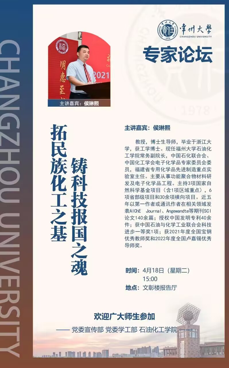 | 【學(xué)術(shù)講座】4月18日常州大學(xué)專家論壇:拓民族化工之基 鑄科技報國之魂 |