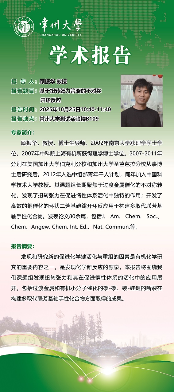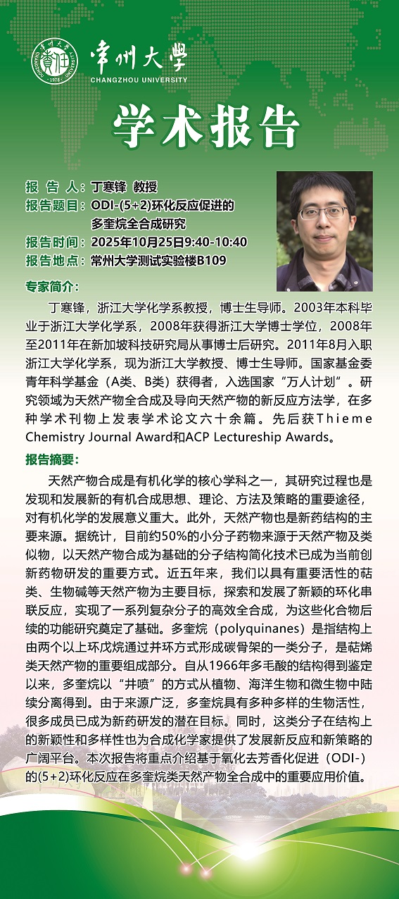 | 【學術報告】10月25日功能雜環(huán)研究院學術報告——丁寒鋒教授 浙江大學 顧振華教授 中國科學技術大學 |